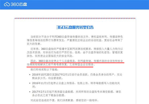 根据360官方微博公告来说,360云盘决定停止个人云盘服务,在网盘存储、传播内容的合法性和安全性得到彻底解决之前,不再考虑恢复,之后转型企业云服务。根据通告,360还将会退还缴费用户的相关费用。